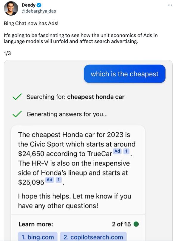 不过,仅从上面案例来看,也有网友担心隐藏的各种问题,比如 TrueCar(为新车和二手车购买者提供的汽车定价和信息网站)是否出售这辆车并支付搜索新本田汽车的费用?或者他们只是一个参考或价格查询网站,付费成为 Bing 的首选汽车价格提供商?为什么这些价格高于本田列出的价格?他们是否向微软支付费用以使出现的答案中不包含 Autotrader、Cars.com 等其他家的价格提供商?用户可以要求答案呈现非赞助结果吗?