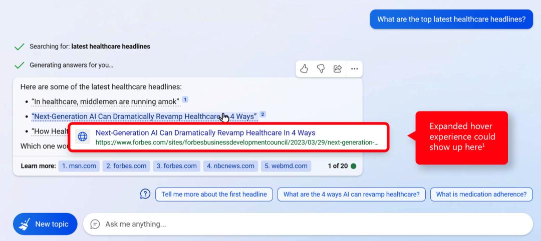 对于 Microsoft Start 合作伙伴,在聊天答案旁边放置 Microsoft Start 许可内容的标题,有助于推动更多用户参与 Microsoft Start 上的内容。微软也还在探索在聊天体验中放置广告,以便与内容有助于聊天响应的合作伙伴分享广告收入。