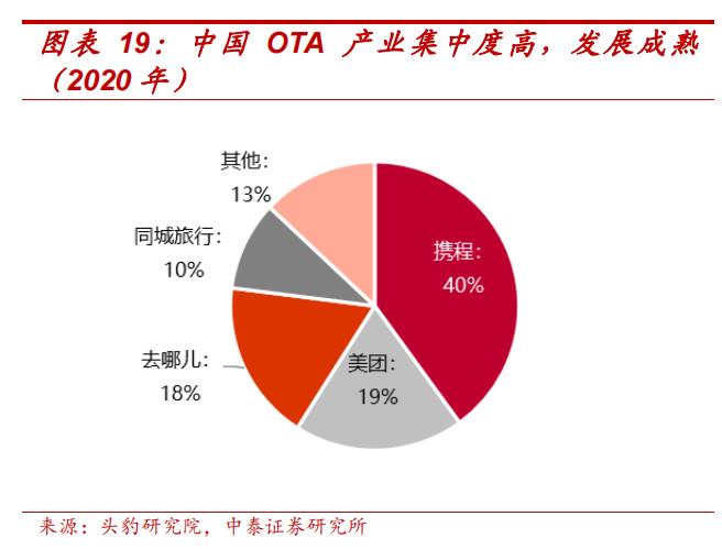 在国内OTA渠道市占率分布上,携程一家基本占据四成市场份额,美团和去哪网位列第二、三位。