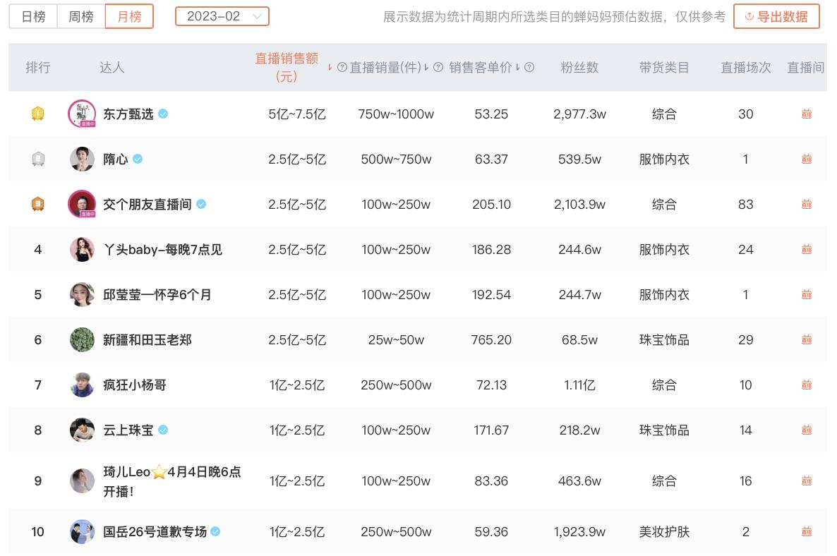 “东方甄选”持续霸榜,“交个朋友”场次最高