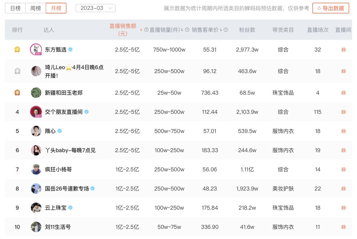 具体来看,据蝉妈妈数据显示,今年3月,抖音带货达人榜中,直播销售额排名前十的达人分别是“东方甄选”、“琦儿leo”、“新疆和田玉老郑”、“交个朋友直播间”、“隋心和丫头baby”、“疯狂小杨哥”、“国岳26号道歉专场”、“云上珠宝”、“刘11生活号”。