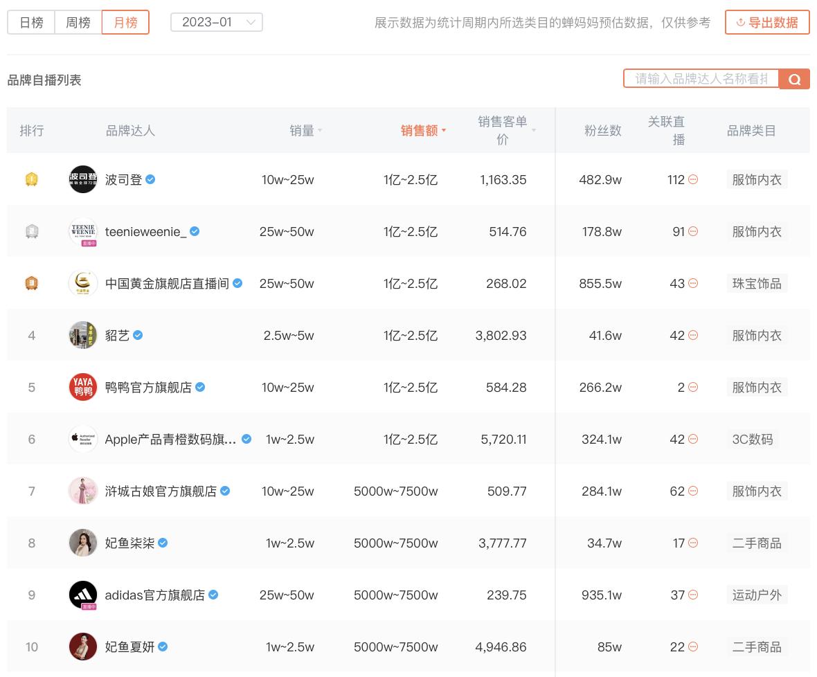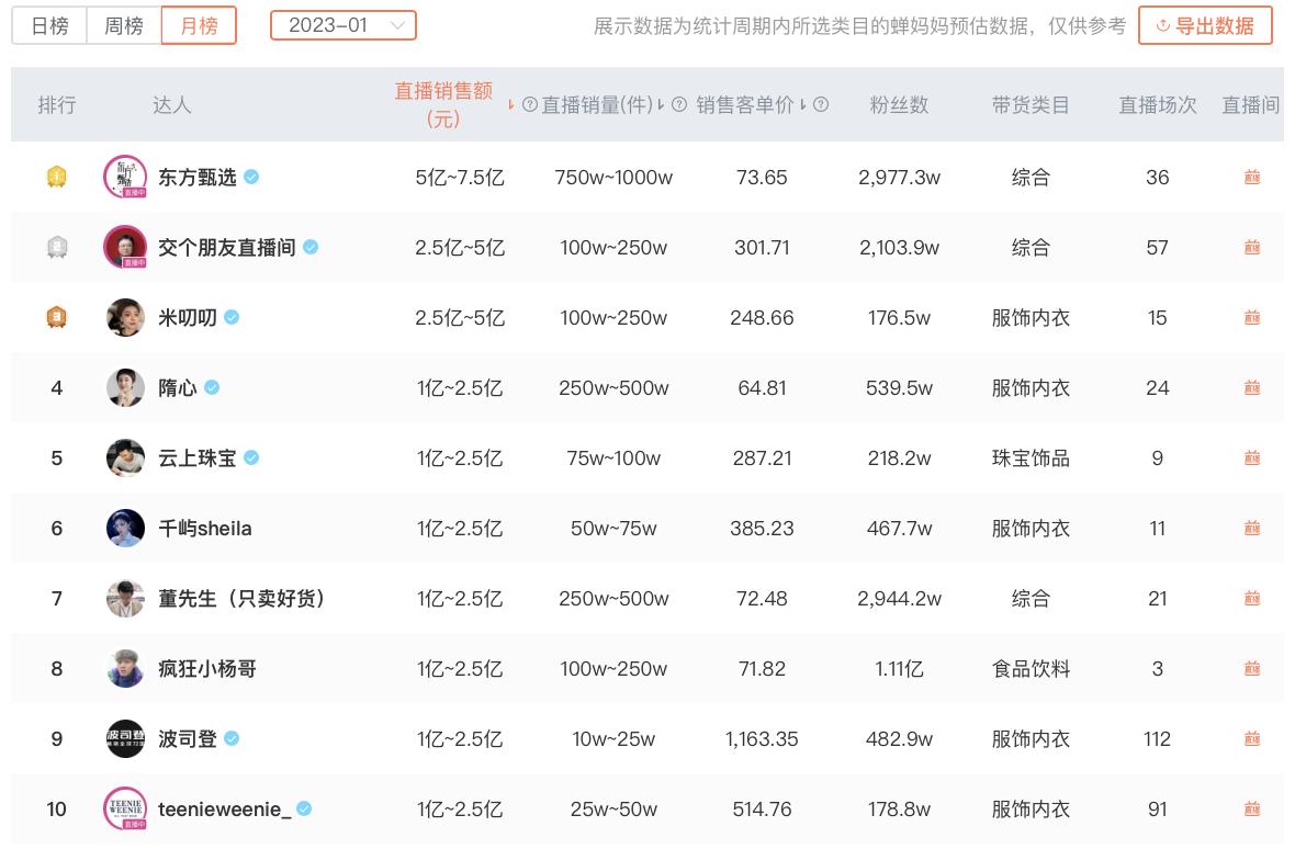 2023年第一季度,抖音带货达人排行变化不大,呈现出强者恒强、头部直播间地位较为稳定的特征。部分主播通过较为高频的直播及垂类影响力创造较高的销售额,带货能力极佳。