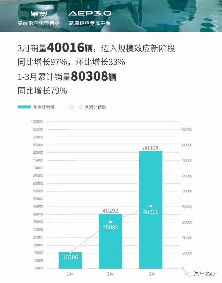 官方数据显示,3 月埃安品牌的销量为 40016 辆,同比增长 97%,环比增长 33%;今年前三个月埃安品牌的累计销量为 80308 辆,同比增长 79%,用埃安自己的话说,埃安已经摸到了规模效应的门槛。