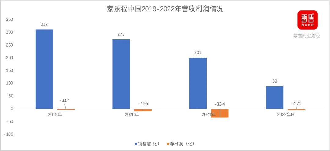 在2019-2021年连续三年间,家乐福中国的整体营收也屡创新低,持续亏损。2020年、2021年和2022年上半年,家乐福中国净利润分别为-7.95亿元、-33.37亿元、-4.71亿元。
