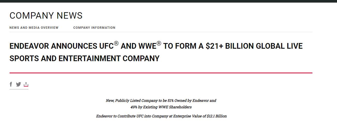 根据两家公司的声明,这笔交易将两个最大的摔跤和娱乐公司联合起来,WWE长达数月的出售宣布结束,WWE的联合创始人兼执行主席Vince McMahon于1月重返公司董事会。