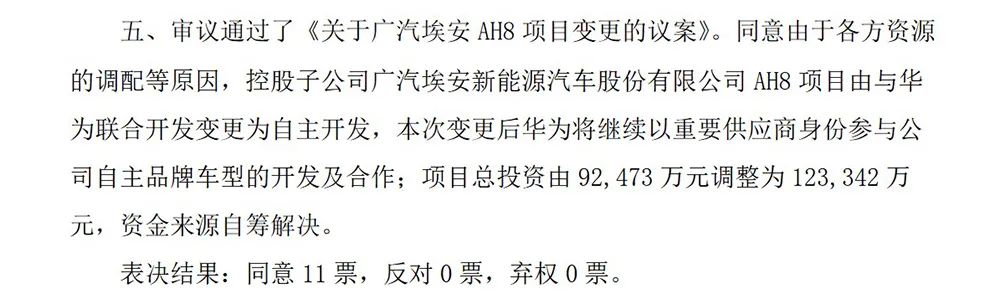 但直到2021年7月,该消息才最终落地。当年7月,广汽集团发布公告称,广汽集团董事会同意广汽埃安与华为(AH8车型)项目的实施。