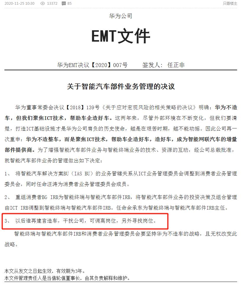 2018年,华为首度明确不造车战略。两年后的2020年11月,任正非签发署名决议,重申“华为不造车”,有效期为三年。“以后谁再建言造车,干扰公司,可调离岗位,另外寻找岗位。”决议的第三条指向明确,措辞严厉。