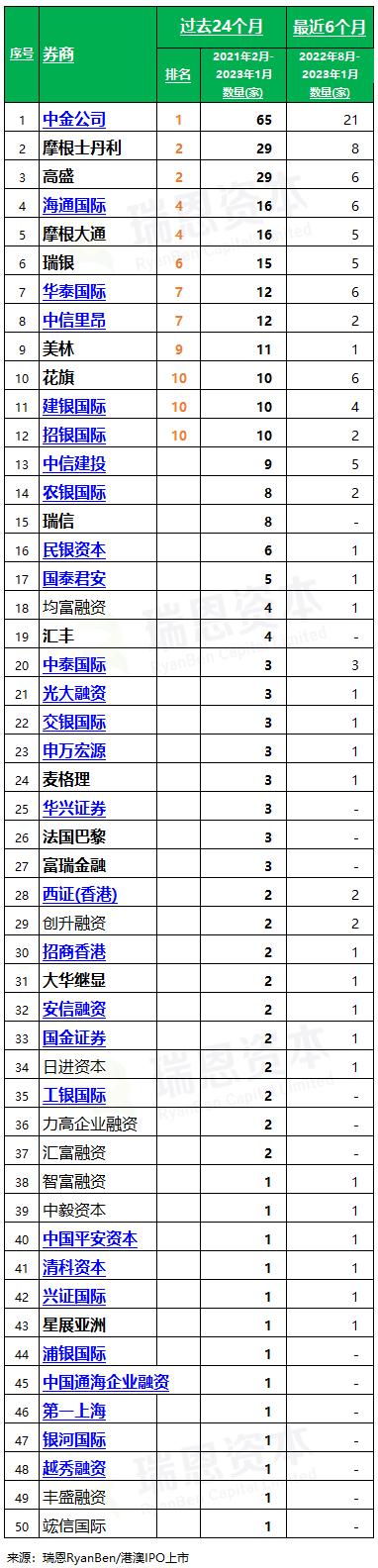 IPO业务方面,根据瑞恩资本的统计,在2021年2月至2023年1月,港新上市公司 184家;在2022年8月至2023年1月,香港新上市公司 57家。IPO保荐情况如下: