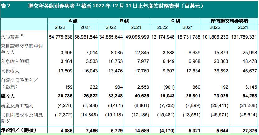 所有联交所参与者2022的净盈利总额为 56 亿元,较 2021 年减少 79%。其中,A 组及 B 组经纪行分别录得 41 亿元和 57 亿元的净盈利,而 C 组经纪行则录得 42 亿元的净亏损。