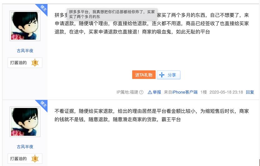 “古风半夜”也是拼多多商家吧,他在百度贴吧中斥责拼多多平台,“我真想把你们总部都给你炸了,买家买了两个多月的东西,自己不想要了,来申请退款,随便填个理由,你直接给他退款,连火都不用退,商品已经签收了也直接给买家退款,在途中,买家申请退款也直接退!”
