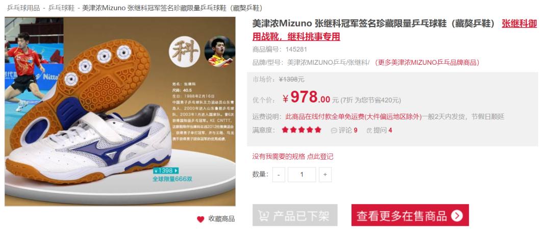 “脚”有日本品牌美津浓等。其过去推出的张继科冠军纪念款美津浓乒乓球鞋,在售卖网站上有一系列与人设相关的后缀,“藏獒乒鞋”、“御用战靴”、“挑事专用”。当然,现在这双后跟处绣着“科”字的鞋已经下架了。
