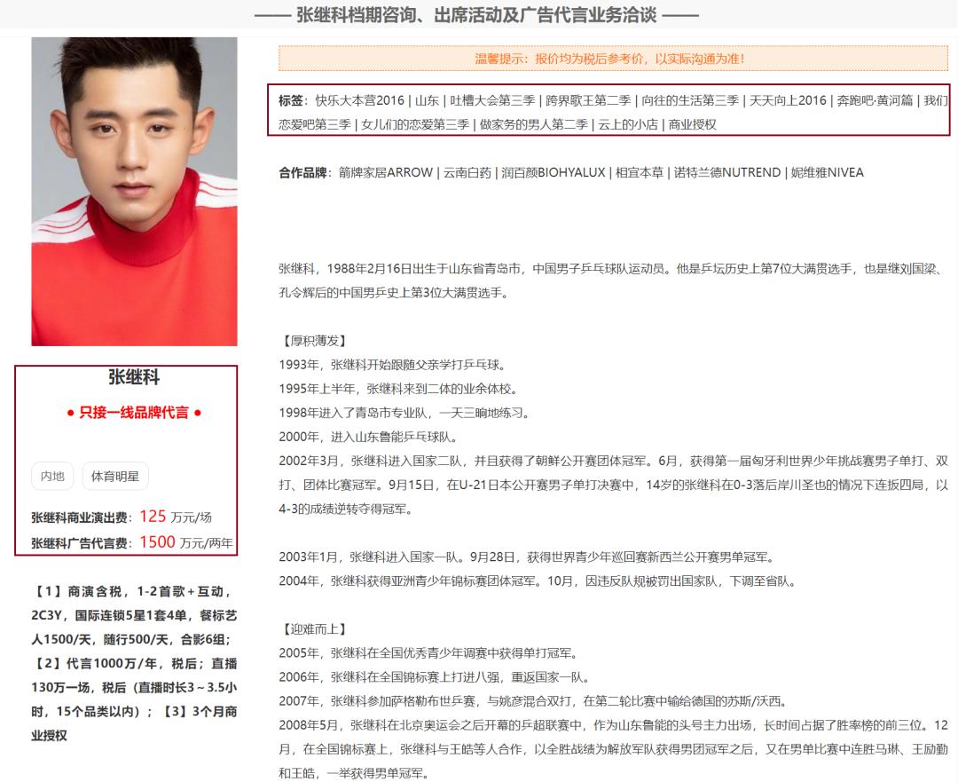 比如戴着大宝石的向太都要参与的直播,再比如代言、上综艺和合作开店。而这些动作都与夸张的数字联系在一起。据不完全统计,张继科先后代言过16个品牌,有媒体报道称其代言费约为1000万元/年。