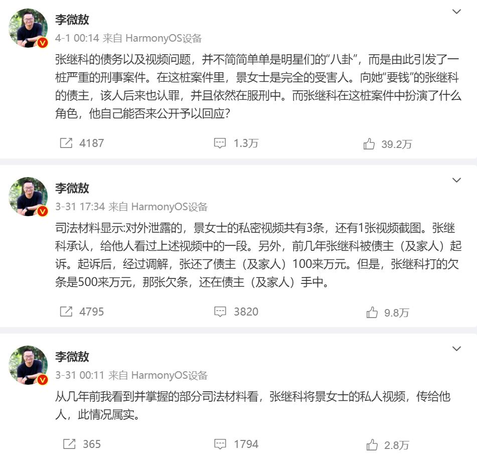 没想到这份声明让经济观察报首席记者李微敖“生气了, 也乐了”,认为工作室威胁起诉网友“过分了”的他,从3月31日起断续发布微博和公众号文章佐证传言。