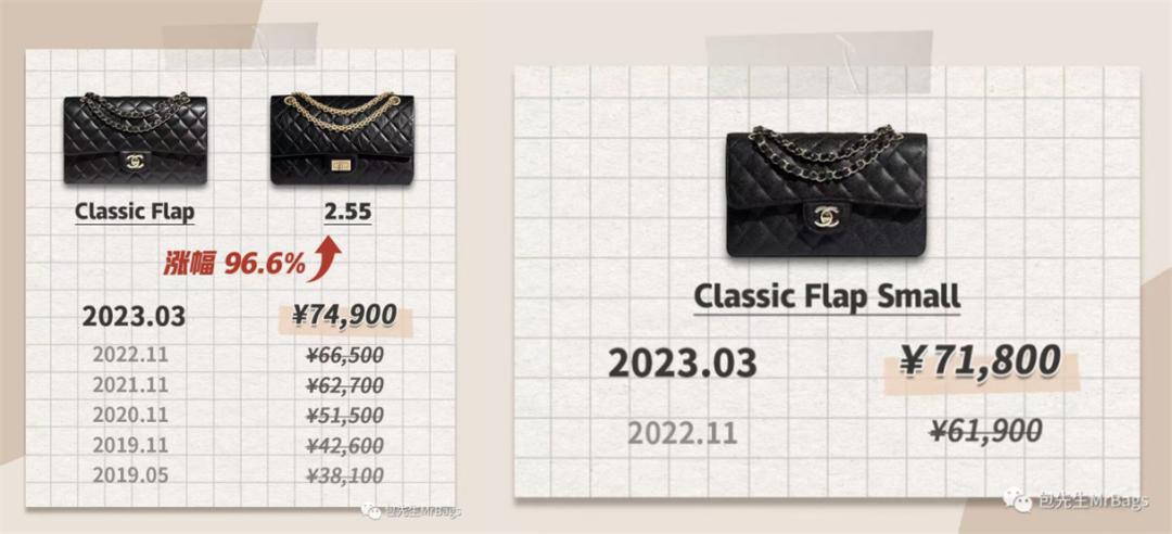 经过最新一轮涨价,香奈儿中号Classic Flap和2.55 Reissue,定价直接飙升到了7.5W这个档位。在2019年,这两款包的价格还在3万元左右,短短不到四年时间,身价已然翻番。