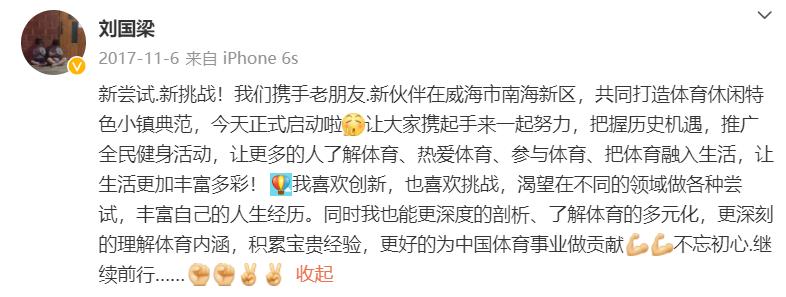 据报道,2017年11月,亲见体育公司与雅居乐签署战略合作协议,将在威海南海新区打造体育休闲特色小镇,刘国梁将担任雅居乐体育产业首席顾问官,王楠则成为雅居乐威海冠军体育小镇镇长,郭斌被称为“威海冠军体育小镇项目合伙人”,彼时,刘国梁在个人微博也表达了对迎接此次全新挑战的浓厚兴趣和高昂斗志。