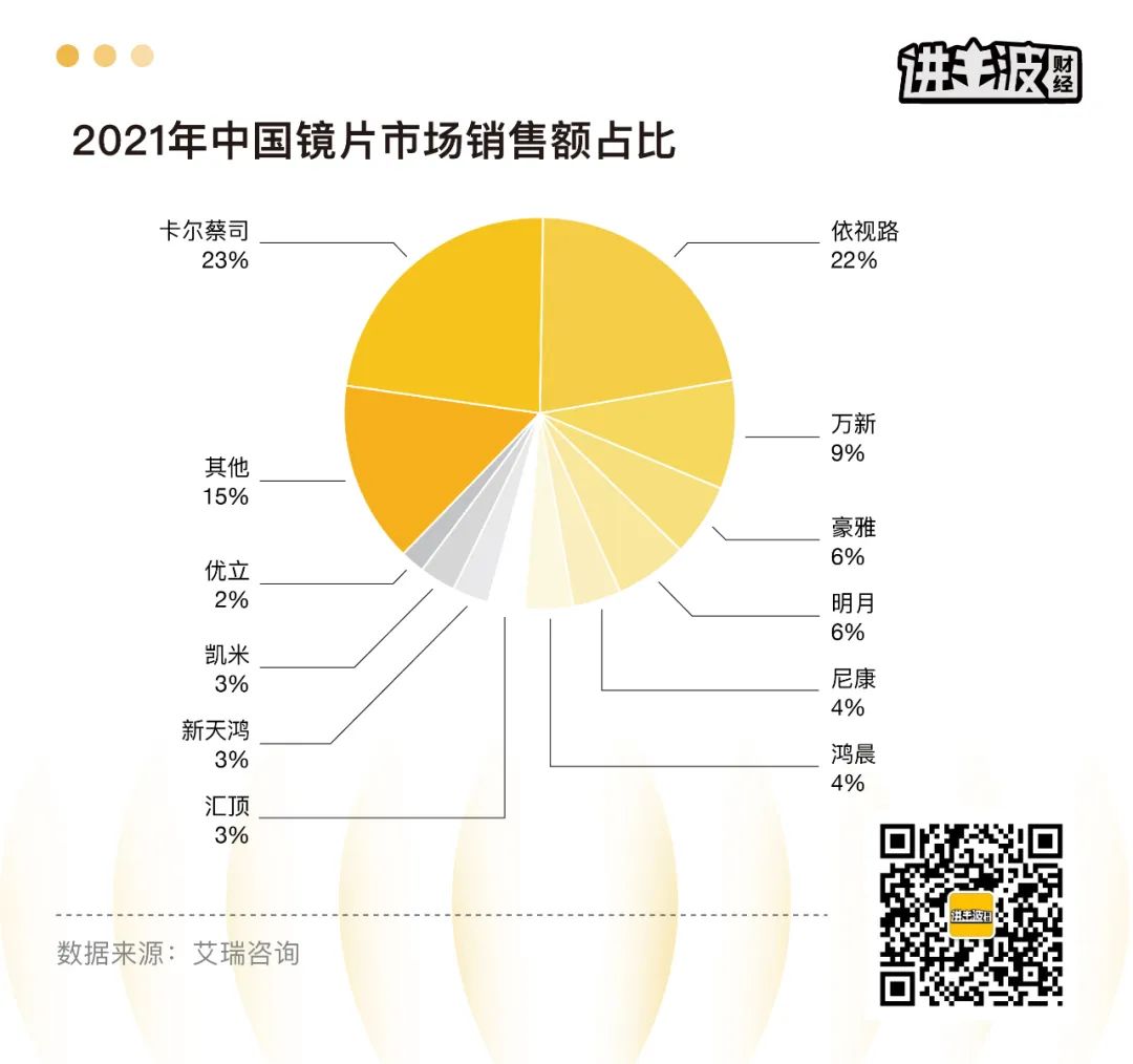 从销售额来看,中国镜片行业集中度比较高,蔡司、依视路、万新、豪雅、明月等头部企业的销售额占85%。蔡司、依视路、万新三个企业就分得了50%以上的市场份额。