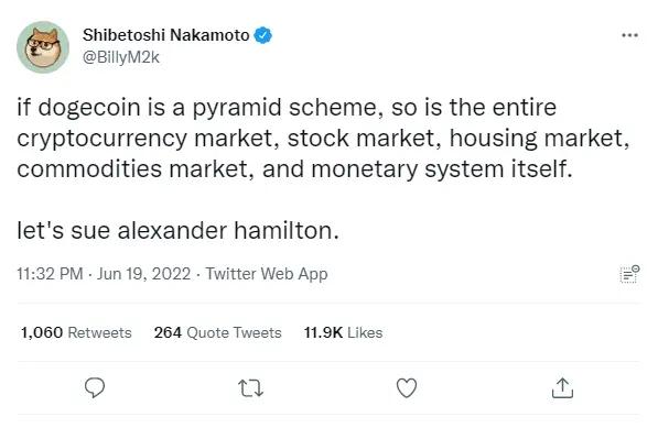 随后,狗狗币创始人 Shibetoshi Nakamoto 在 Twitter 上对 Keith Johnson 进行了反驳,他表示:如果狗狗币是金字塔计划,那么整个加密货币市场、股票市场,商品市场和货币体系本身也是如此。