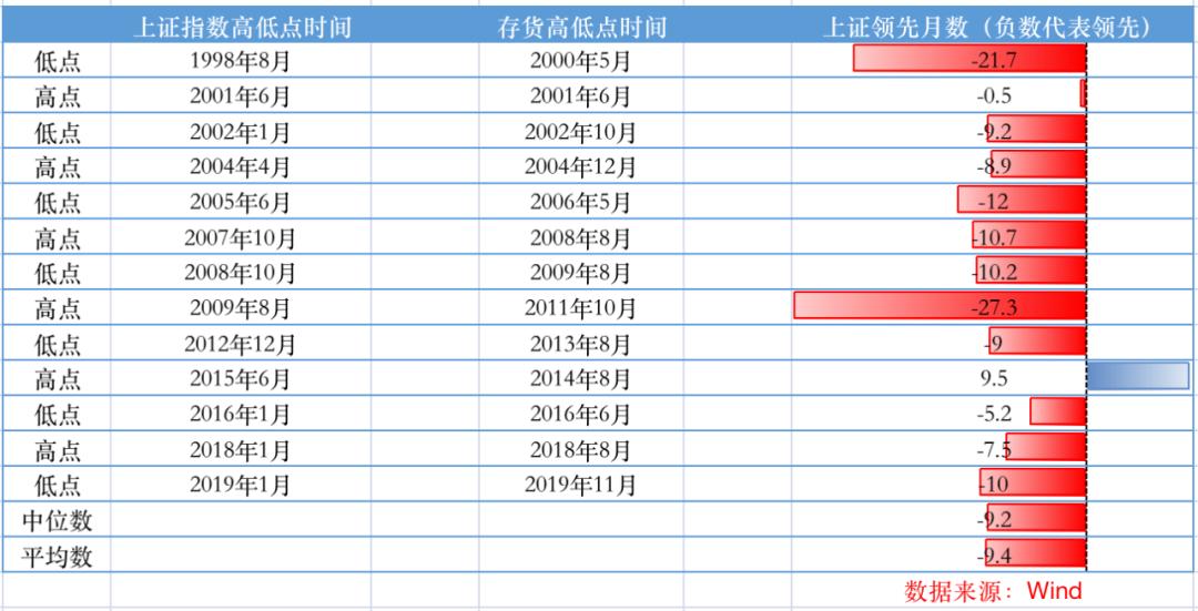 从历史来看,除了2015年,上证指数晚于库存周期高点见顶,其余时间,无论高低点,上证指数的重大高、低拐点都提前于库存周期。这个时间在0.5个月至27.3个月不等,平均领先9.4个月。