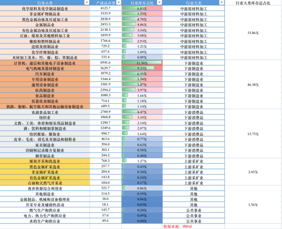 具体来看,下游制造业中,计算机通信、电气机械、汽车制造、通用设备等库存占比均超过了5%;而在中游原材料加工行业,化学原料、非金属矿物的库存占比超过了5%,黑色金属冶炼也处于5%左右的较高水平。