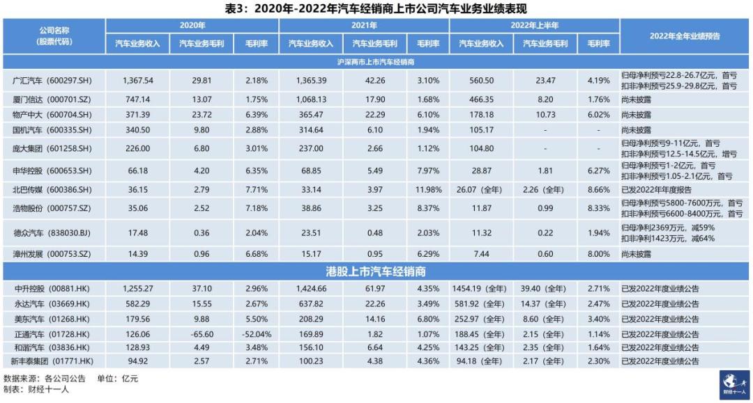 经销商的盈利能力十分脆弱,只要市场环境稍有恶化,就很难避免亏损。根据汽车经销商多家上市公司的财报,在汽车销售业务上,经销商的毛利率通常只有个位数,超过5%已经算高毛利水平了,港股上市的几家经销商集团主销均为豪华品牌,毛利却仅有2%左右。