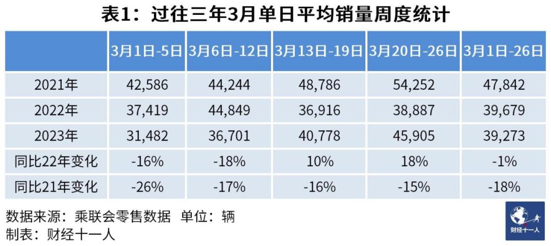 从零售数据上看,2023年3月的单日平均销量逐周递增,但这并不能证明“以价换量”的目标达成了。3月后两周同比2022年的增速由负转正,主要是因为2022年3月后两周部分地区疫情抬头,基数偏低所致。相比2021年3月,下滑幅度高达两位数,这说明虽然有热度空前的价格战,但2023年3月的汽车市场,尚没有恢复到正常年份的常规水平。