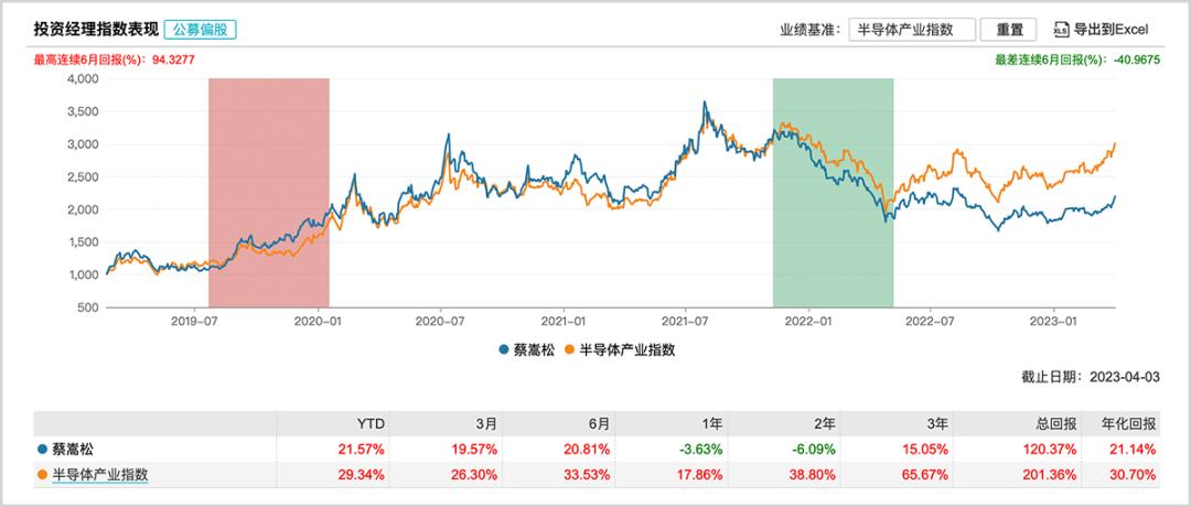 从年初至今(4月3日),蔡嵩松所管基金的整体回报率为21.57%,而Wind半导体产业指数的同期涨幅已经来到了29.34%。
