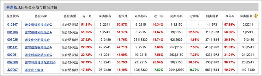 如蔡嵩松招牌的诺安成长,今年以来在同类的3480个基金中,由后10%快速提升至110名;诺安优化配置、创新驱动及核心灵活配置也都回升到了同类的前2%。