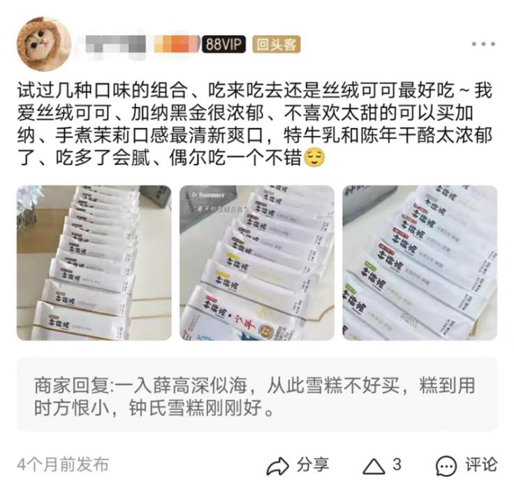 网友二:其实钟薛高一个款牛乳味的挺好吃的,就是价格偏贵了。