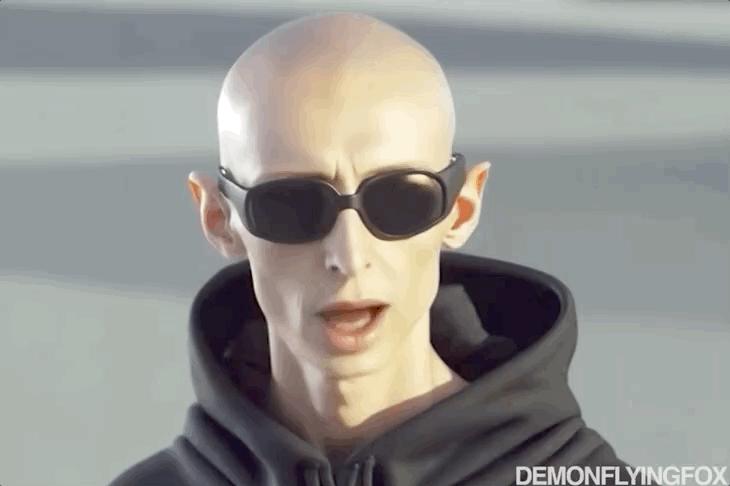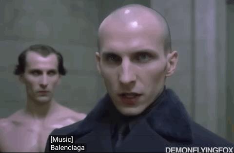 它不光精准还原了魔改人物的特点,也抓住了巴黎世家的精髓:毫无生气的眼神+凌厉的面部线条+突出的颧骨。
