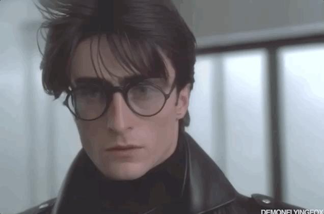 1990 screengrab of male model Harry Potter wearing oversized black leather jacket with bold shoulder pads, slim-fit jeans, and a simple white t-shirt, fashion movie scene, Balenciaga commercial —ar 3:2 —v 5 —q 2