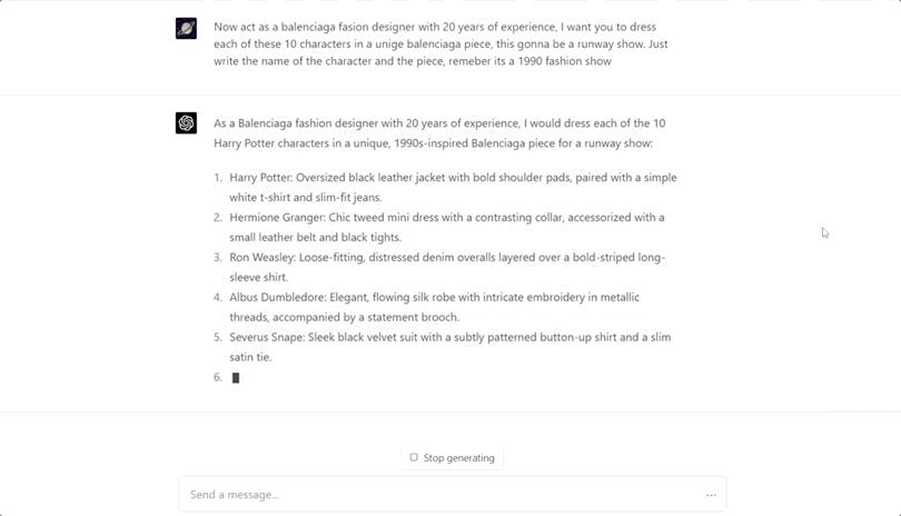 接下来,将这些角色的名字给到ChatGPT,并暗示它生成“巴黎世家时装秀”风格的提示词: