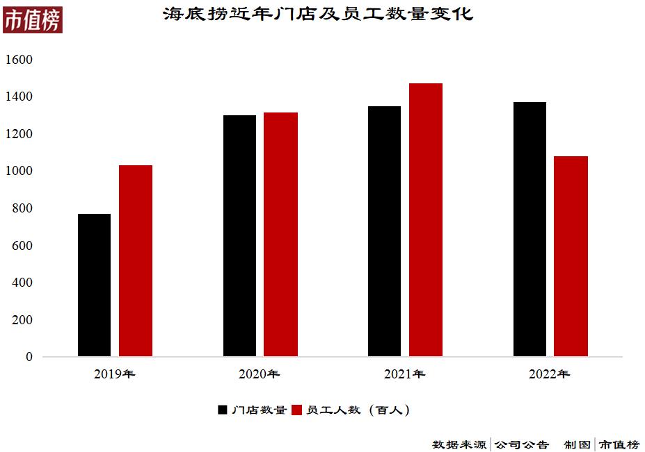 梳理发现,海底捞2022年末的员工数量为10.75万人,比2021年末削减了近4万人,近四年间的员工数量仅高于2019年的10.28万人。而且,在门店数量不降反增的情况下,员工数量反而有所减少。