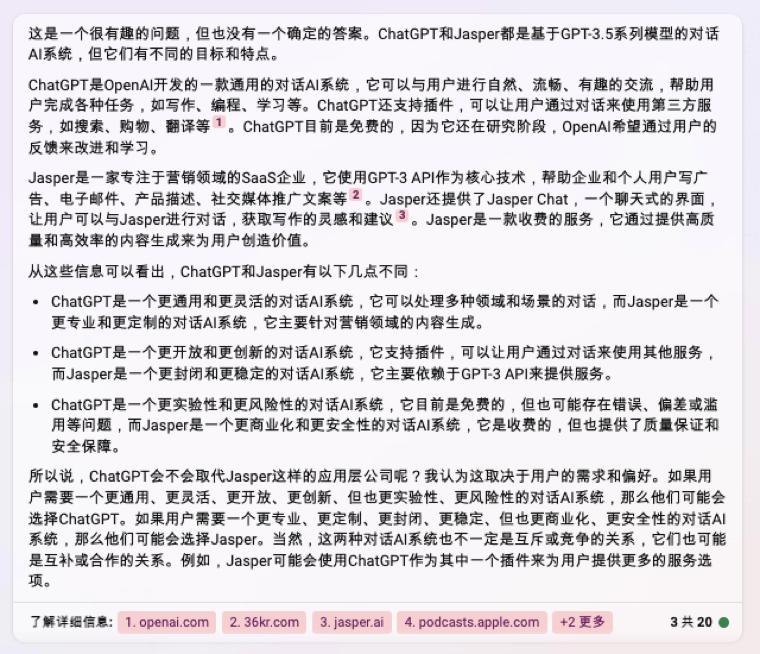 “推出插件之后,ChatGPT会取代Jasper一类的应用层公司吗?”我使用ChatGPT支持的New Bing提问,它给出了一个很完整、妥帖的开放性答案——这取决于用户的需求和偏好。
