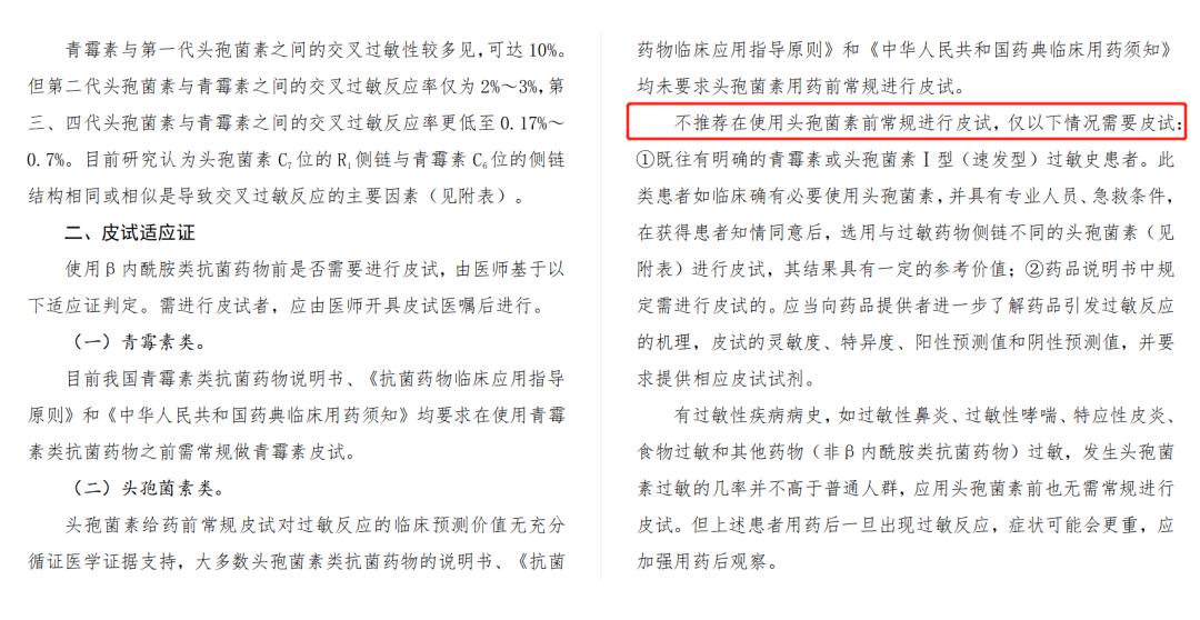 2021 年,卫健委发布《β 内酰胺类抗菌药物皮肤试验指导原则》(下称《指导原则》) [2] ,指出不推荐在使用头孢菌素前常规进行皮试,仅在既往有明确的青霉素或头孢菌素 Ⅰ 型过敏史、药品说明书明确规定的情况下实施皮试。