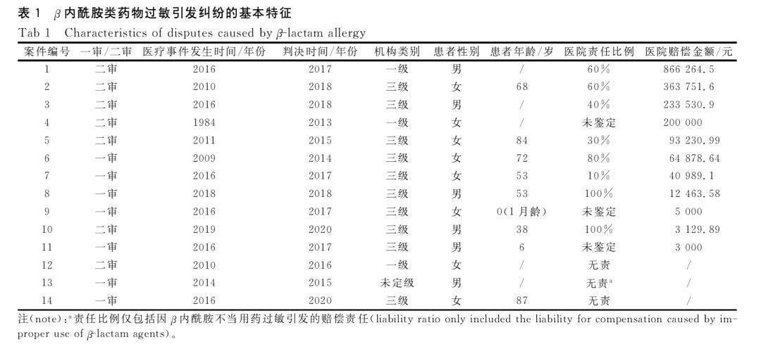 截至 2020 年,中国裁判文书网共公开 14 例 β 内酰胺类抗菌药物有效案件,判决有责原因主要是超说明书用药、未关注过敏史,超半数案件出现过敏史询问不详细、对交叉过敏反应没有尽到注意义务等情况。