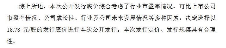最后公司表示,本次公开发行底价综合考虑了行业市盈率情况、可比上市公司市盈率情况、二级市场交易价格、公司成长性和行业及公司未来发展前景等因素,决定选择以18.78元/股的发行底价进行本次公开发行。本次发行定价、发行规模具有合理性。