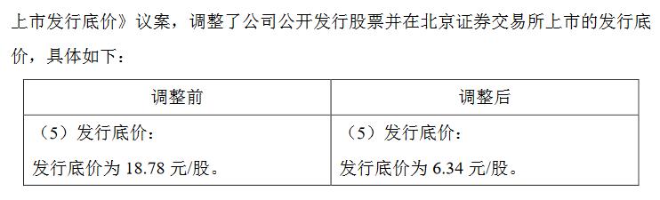 目前,公司于2023年4月4日发布公告表示,根据证券市场的变化情况和维护股价稳定的需要,董事会、监事会审议通过了调整北交所IPO发行底价的议案,将发行底价从18.78元/股调低至6.34元/股,与2022年归属于挂牌公司股东的每股净资产一致。
