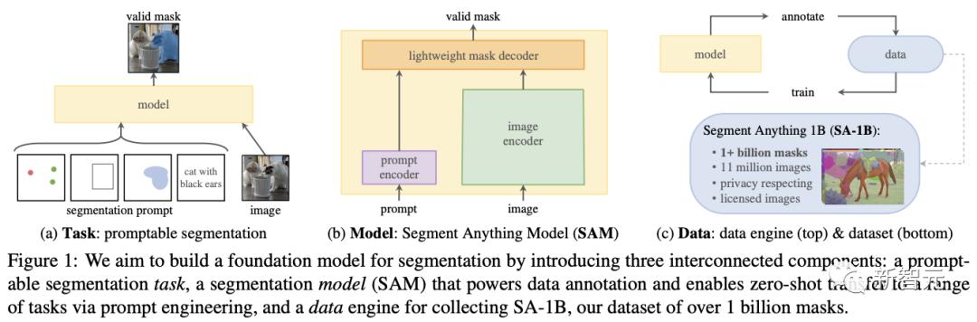 研究人员训练的SAM可以针对任何提示返回有效的分割掩码。提示可以是前景/背景点、粗略的框或掩码、自由形式的文本,或者总体上任何指示图像中需要分割的信息。