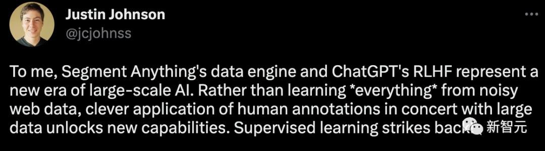 Meta科学家Justin Johnson表示:「对我来说,Segment Anything的数据引擎和ChatGPT的RLHF代表了大规模人工智能的新时代。与其从嘈杂的网络数据中学习一切,不如巧妙地应用人类标注与大数据相结合,以释放新的能力。监督学习强势回归!」