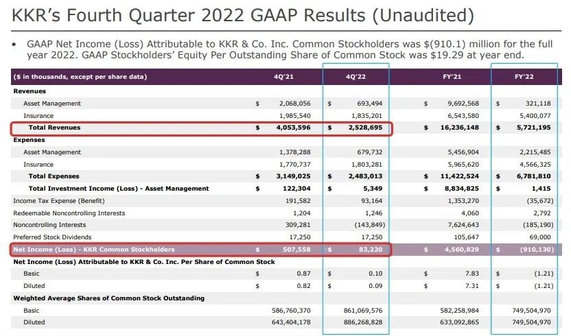 先来梳理KKR最新出炉的2022年第四季度财报。这三个月,KKR的收入从40.5亿美元下降38%至25.3亿美元;净利润为8320万美元,虽然相比去年同期盈利的5亿美元仍有巨大差距,但这一数字与前一季度几近一亿美金的亏损已经有了回调。