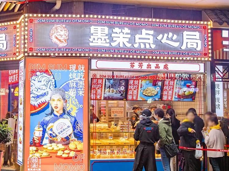和虎头局类似的还有墨茉点心局,它们有着相似的新潮门头和产品包装,和相似的产品形态:中点西做、现烤现卖。一大批年轻人不惜在酷暑中大排长队,只为买上一袋麻薯。