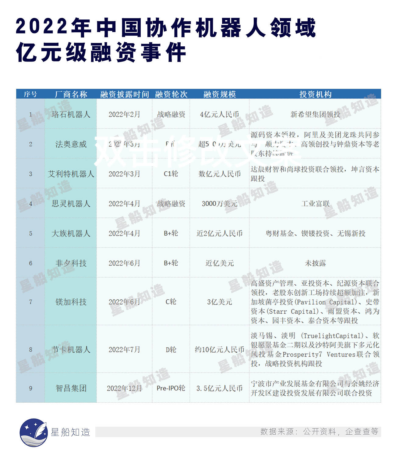 2021年全年,行业内共有13例融资事件,融资总额50.28亿元,创下历史新高;据e-works不完全统计,2022年中国协作机器人市场共发生13起,融资总规模超过50亿元人民币。