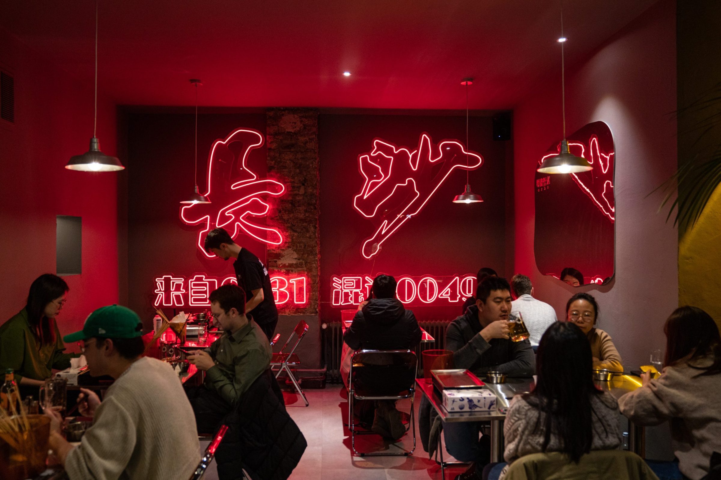 为了鼓励顾客到小红书发帖,部分餐厅开始尝试迎合中国互联网用户偏爱的视觉审美情趣。2022 年 12 月试营业的 0731 中国串烧餐厅(0731 Chinese Skewer Restaurant),布置了霓虹灯书法墙,很有中国的网红营销美学特色。三国烤鱼餐厅(Three Kingdoms)则重现了现代都市中餐厅的细节:从二维码菜单,到铺满白酒瓶的柜台展示,再到“请理性饮酒”的标牌。