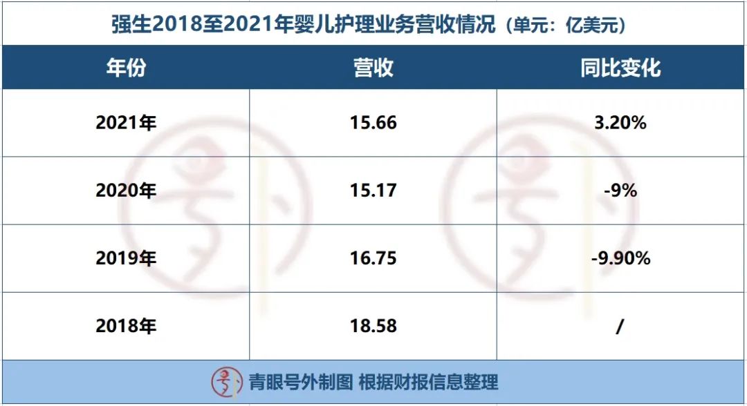 据其财报显示,2019年、2020年强生的婴儿护理业务板块营收分别为16.75亿美元(约合人民币115亿元)、15.17亿美元(约合人民币104亿元),连续两年下滑,直到2021年才略有增长。
