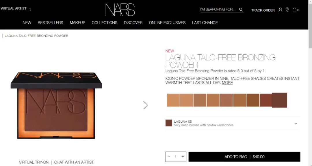 据NARS美国官网显示,该品牌确实已推出了最新版本的“LAGUNA拉古纳修容粉”,且在醒目位置标识“Talc free(无滑石粉)”。最新版本共有9个色号,售价40美元(约合人民币为275元)。但目前暂未在日本和中国官网上线。