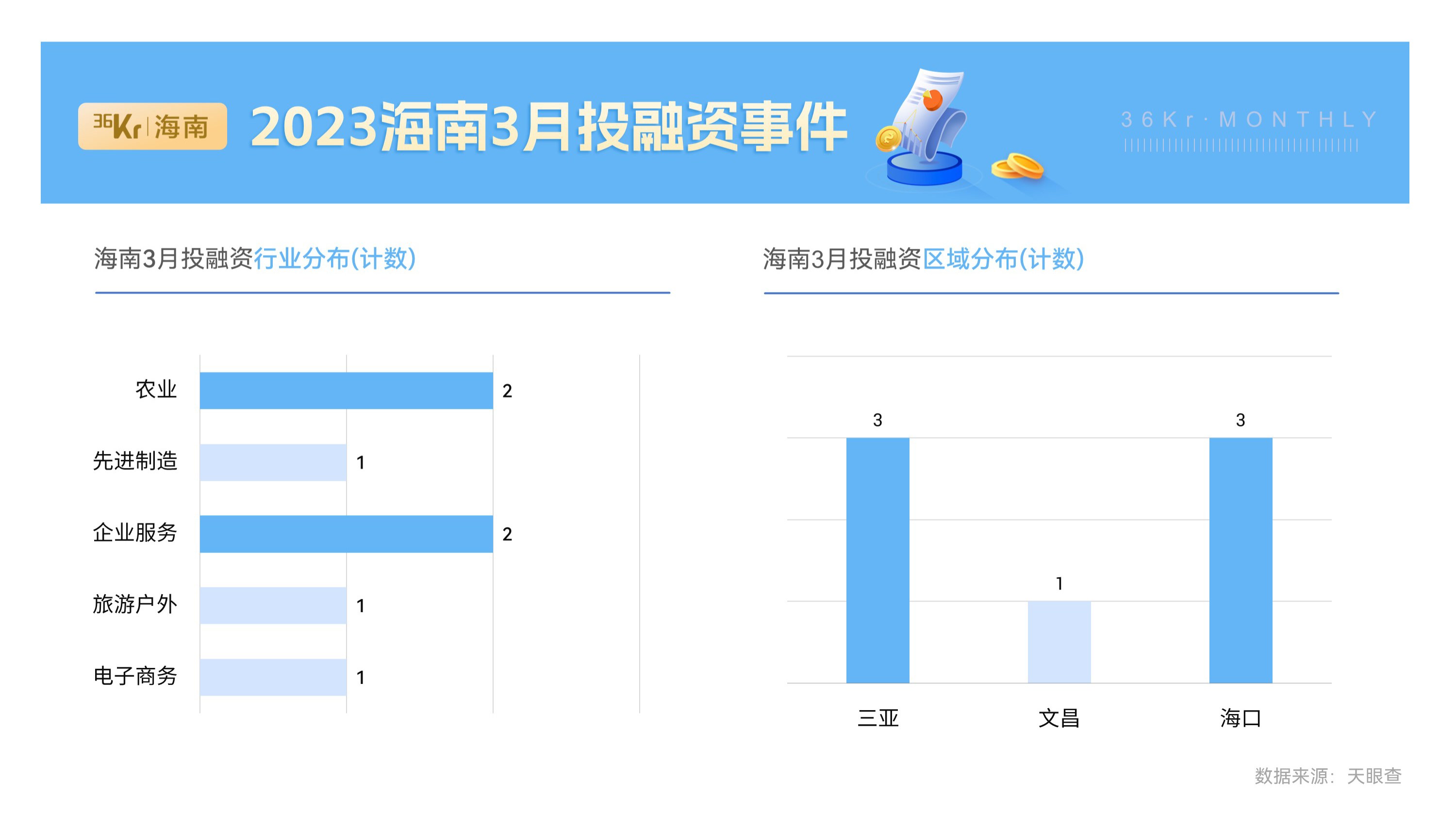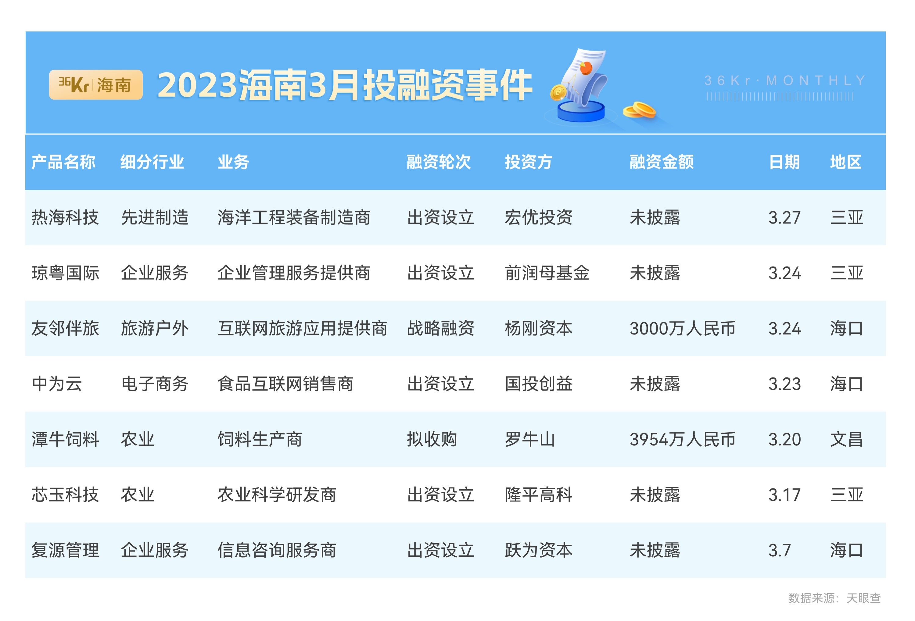2023年3月,36氪海南根据公开信息,对海南省内发生的投融资交易事件进行了盘点,以便海南新经济参与者了解各赛道发展趋势和投资关注点。