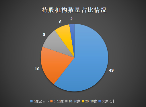 从上图可以看到,机构持股不超过5家的企业占比约6成,共计124家机构;5家以上机构持股的企业占比4成,合计有507家机构。