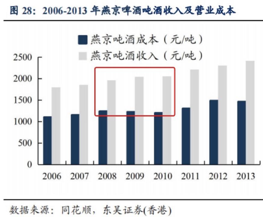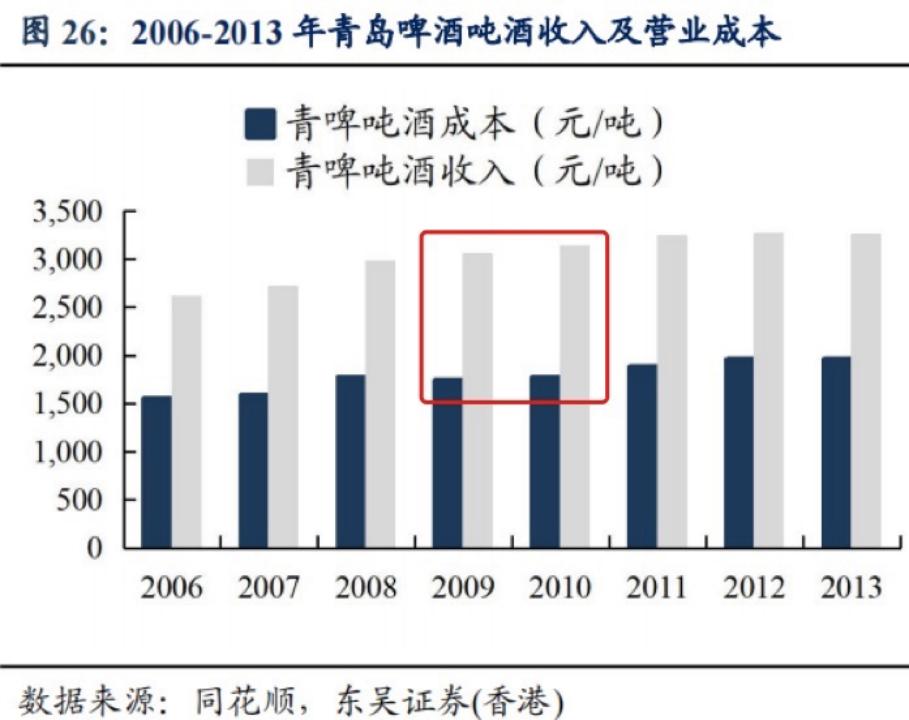 以青岛啤酒为例,在2008年之后的两年内,每吨啤酒成本稳定后,收入也在提升。