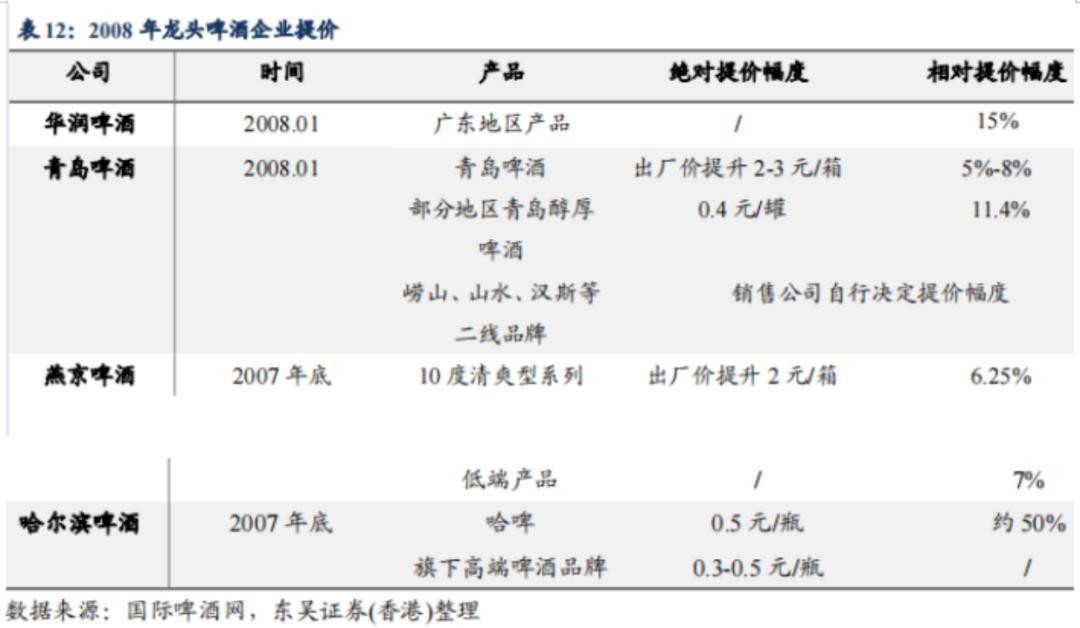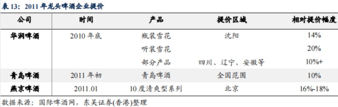 尤其是青岛啤酒,在2008年时,采取了区别性产品涨价举措,但在2011年,所有产品整体提价10%。