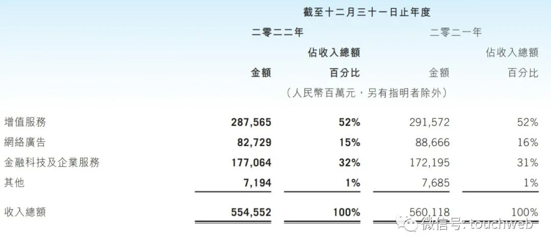 腾讯2022年来自增值服务营收为2875.65亿元,占营收比例为52%;来自网络广告营收为827.29亿元,占营收比例为15%;来自金融科技及企業服務营收为1770.64亿元,占营收比例为32%。